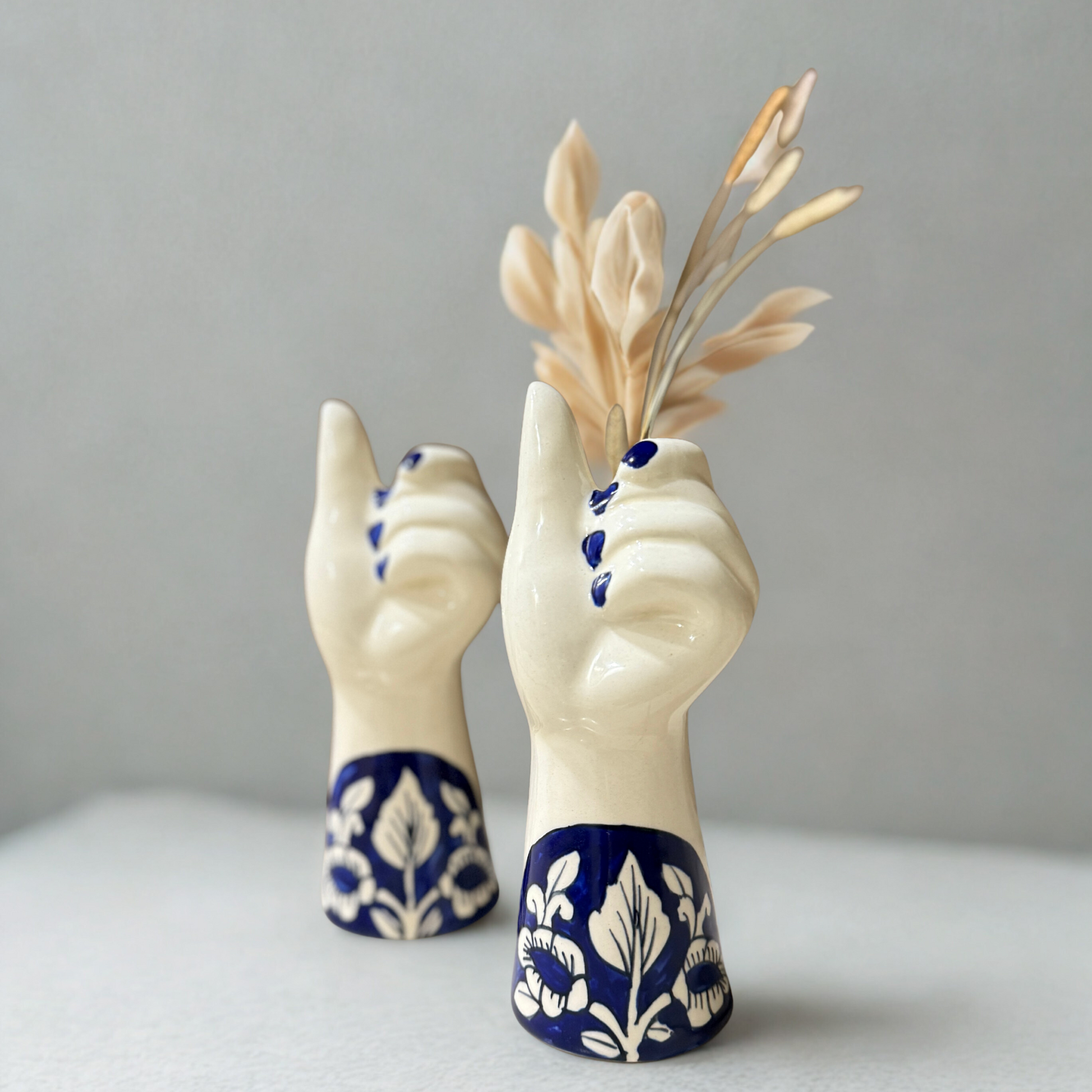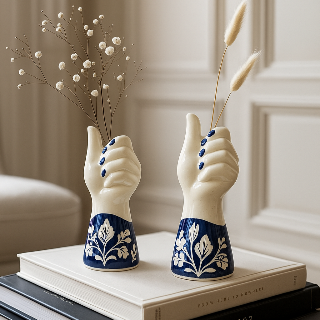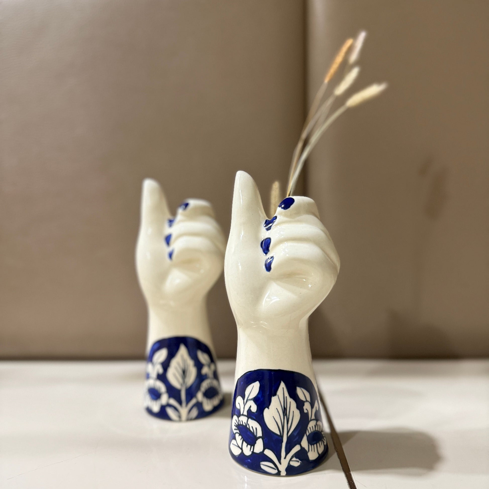 A striking pair of ceramic vases sculpted in the form of a MUDRA, each detailed with indigo floral motifs inspired by Mughal art and traditional Indian craftsmanship. The ivory-toned base gracefully curves into a thumb-up form — a gesture of positivity, offering, and elegance. Intricate white florals bloom reminiscent of hand-painted frescos from Rajasthan’s palaces. These vases are not just decor — they are expressions of reverence, rooted in history, and styled for modern and neo classical homes. Perfect as stand-alone accents or paired with dried blooms, they carry a sense of quiet power and timeless tradition.