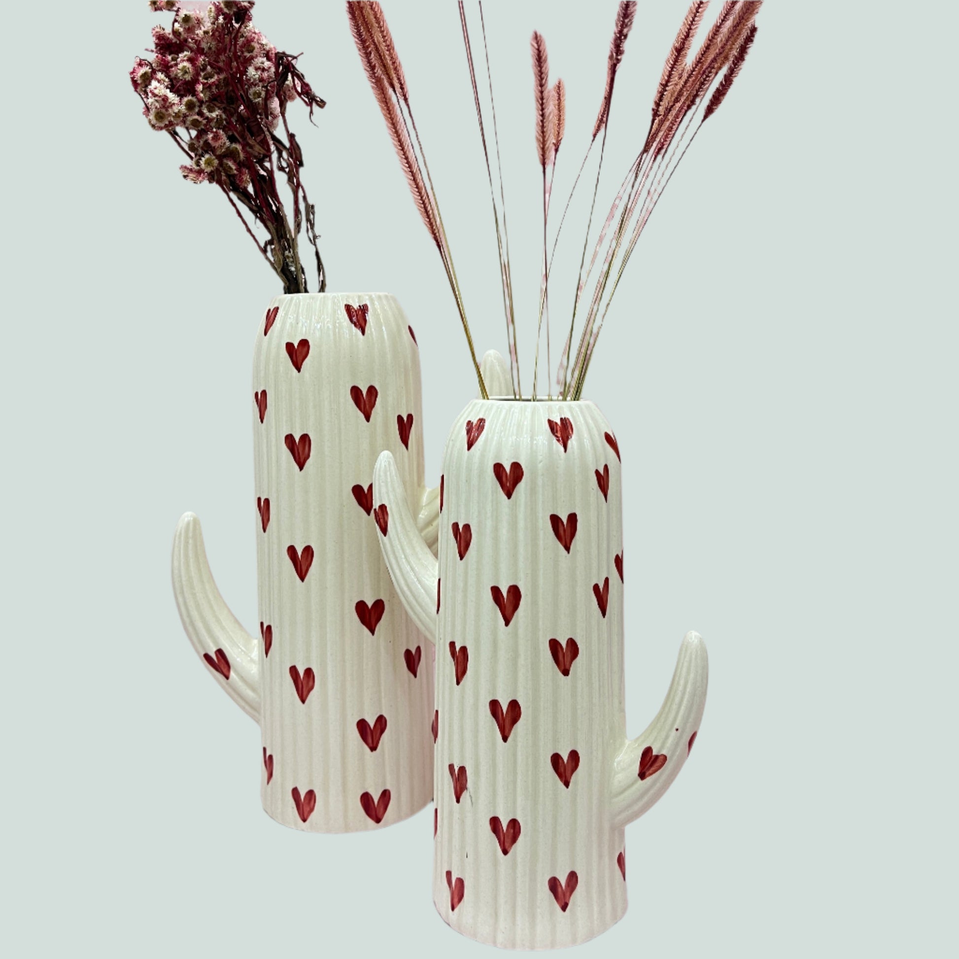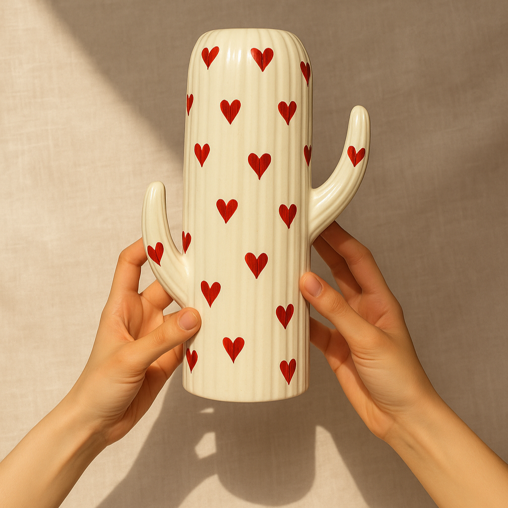 Fall in love at first sight with our LoveSpikes Vase — a whimsical ceramic cactus-shaped vase adorned with playful red heart patterns.