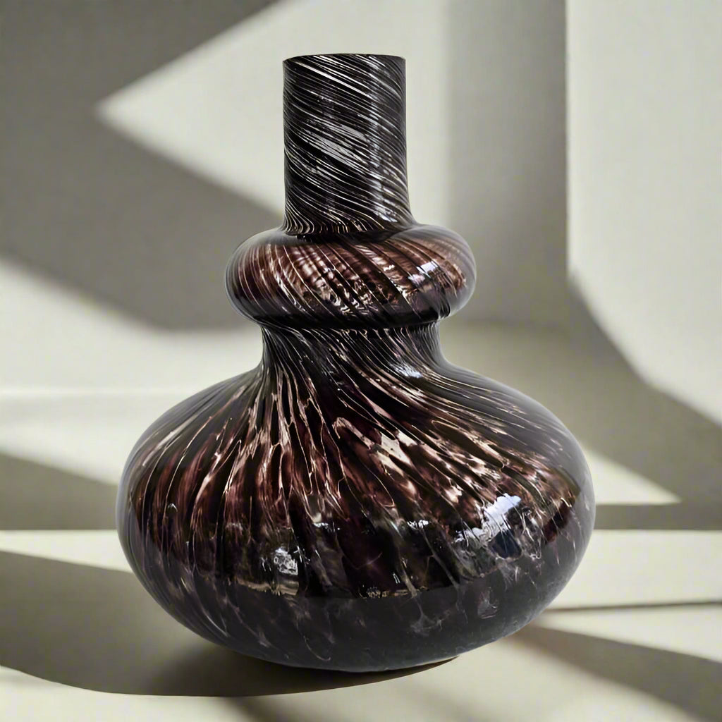 A statement in sculptural elegance, the Veloura Vase is hand-blown from premium glass and adorned with rich maroon and ebony swirls that dance in a mesmerizing spiral. Its graceful curves and lustrous finish catch the light beautifully, making it a striking centrepiece whether styled with blooms or left as an art object. Perfect for modern, minimalist, or opulent interiors, Veloura adds depth, drama, and timeless sophistication to any space.